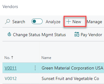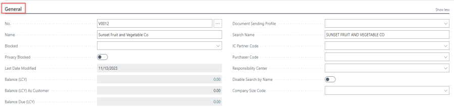 - No. - Select the number series for the Vendor Card. This field is either filled automatically from the number series, or you can enter the number manually if you have enabled manual number entry on the No. Series page.