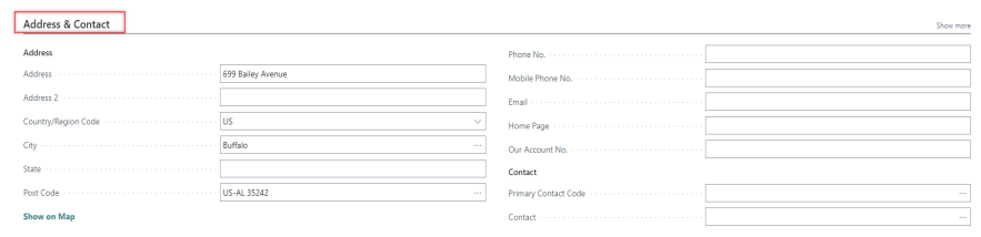 On the Address & Contact FastTab, select/enter the information in the following fields: