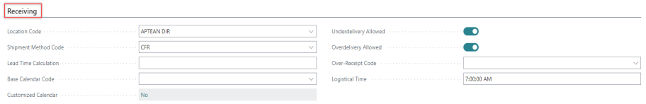 - Underdelivery Allowed (Toggle) - Specifies whether underdelivery is permitted for this vendor, and the allowed percentage of underdelivery is determined on a per-item basis.