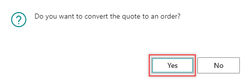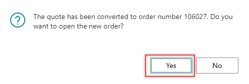 A dialog box appears indicating that the quote has been successfully converted. You are also prompted to choose whether to open the newly created order.