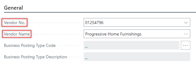 On the General FastTab, enter the value in the Vendor No. or Vendor Name field. The system automatically populates the values in the related fields based on the selected vendor.