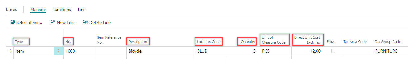 On the Lines FastTab, enter the values in the Type, No., Description, Location Code, Quantity, Unit of Measure Code, and Direct Unit Cost Excl. Tax fields.