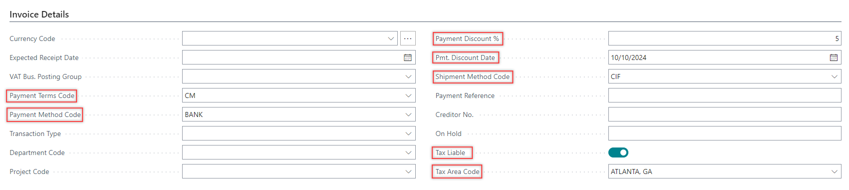 On the Invoice Details FastTab, enter the values in the Payment Terms Code, Payment Method Code, and Shipment Method Code fields based on the applicable tax information. Additionally, verify that the values in the Payment Discount % and Pmt. Discount Date fields are accurate.