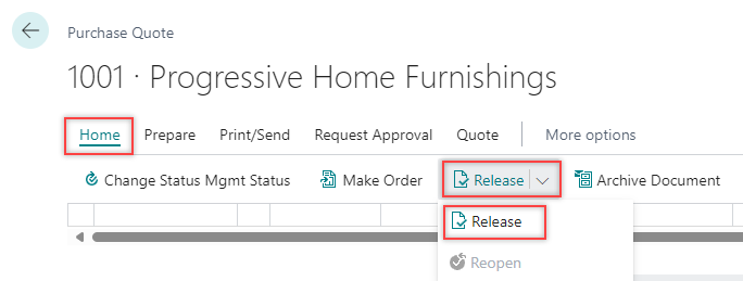 The Status field value is changed from Open to Released.Once approved, the quote can be made into a purchase order from the purchase quote card.