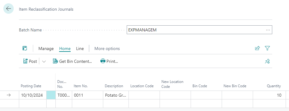 The values in the Posting Date and Document No. field values are automatically populated. The Unit of Measure code is also filled in by default but can be modified as needed.