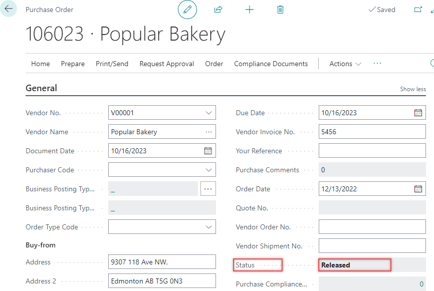 The Purchase Order card page opens. -