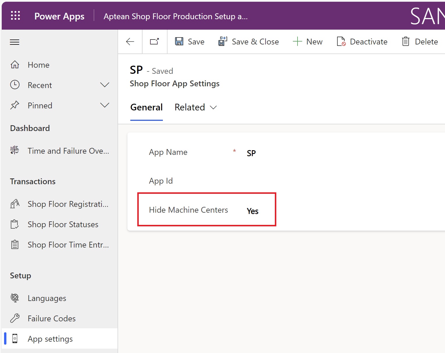 - Customers using only the Work Centers can now hide the machine centers in the Shop Floor Production Power App. Through the Shop Floor Production Model Driven Power App, the Hide Machine Centers field can be set to Yes for the SP Shop Floor Production Setup record on the SP Shop Floor App Settings page.