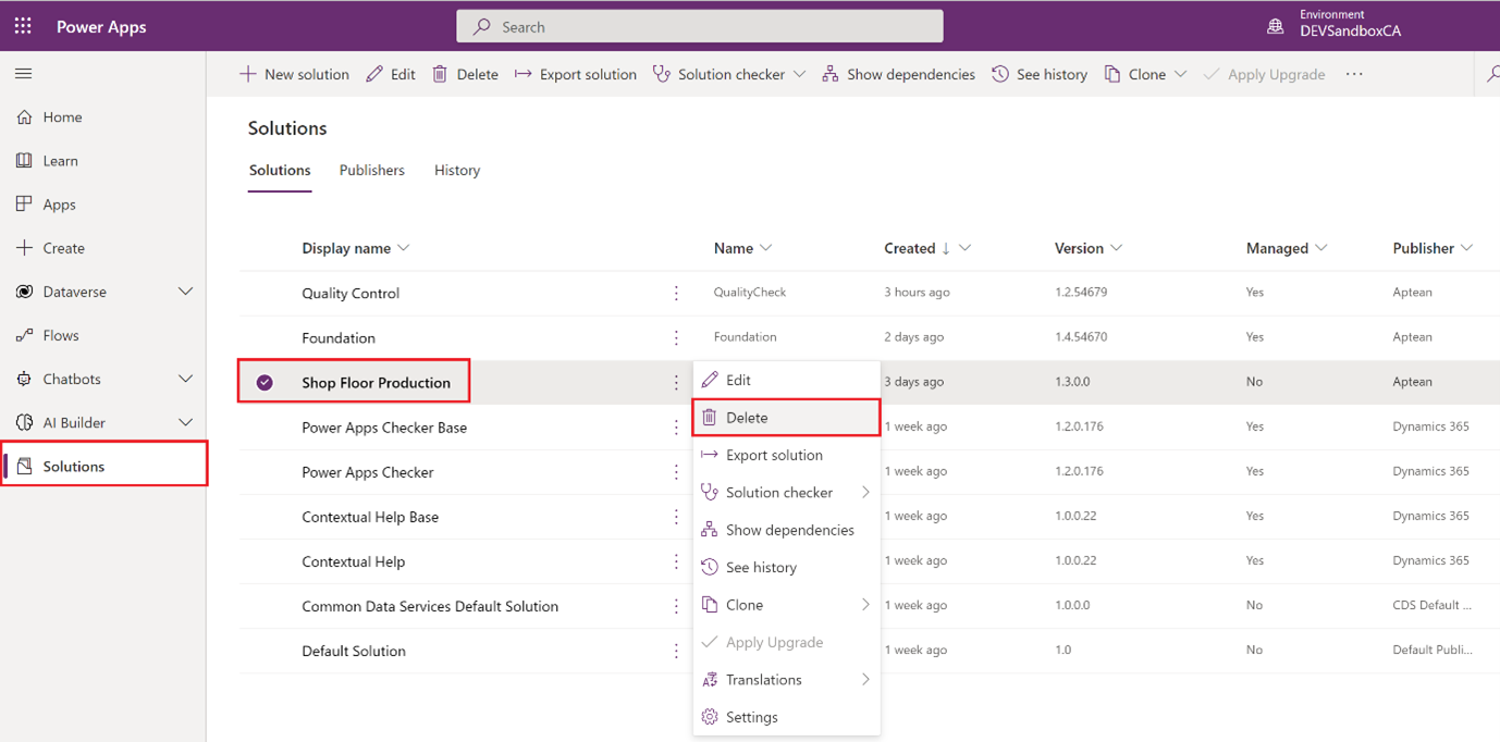Delete the Shop Floor Production Unmanaged Solution from your environment.