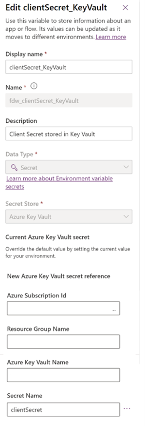 For the ClientSecret_KeyVault, the path to be entered as the current value, in this case, are shown as separate fields.