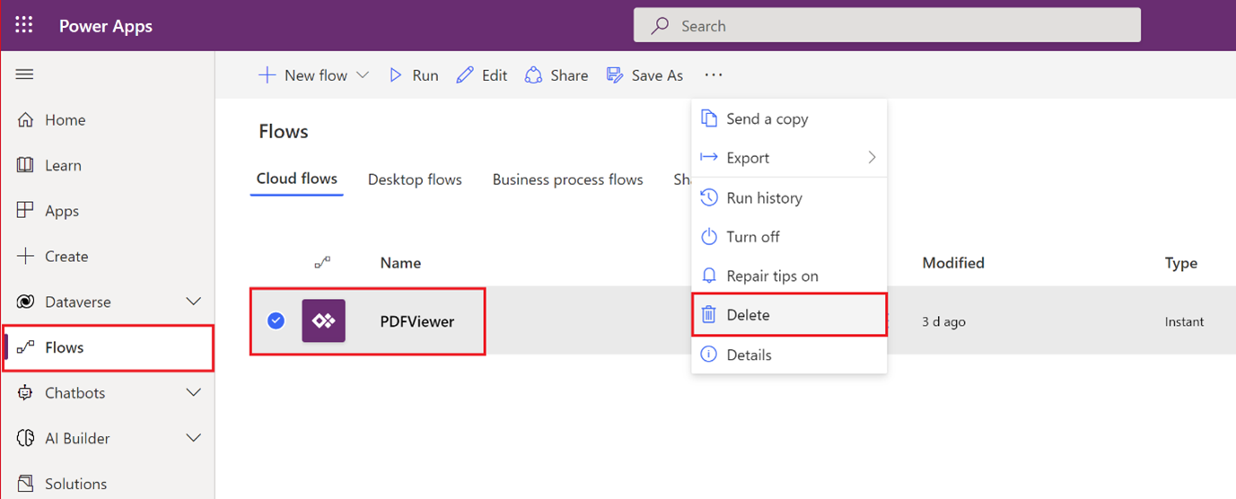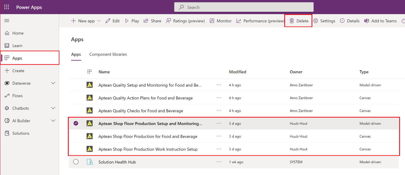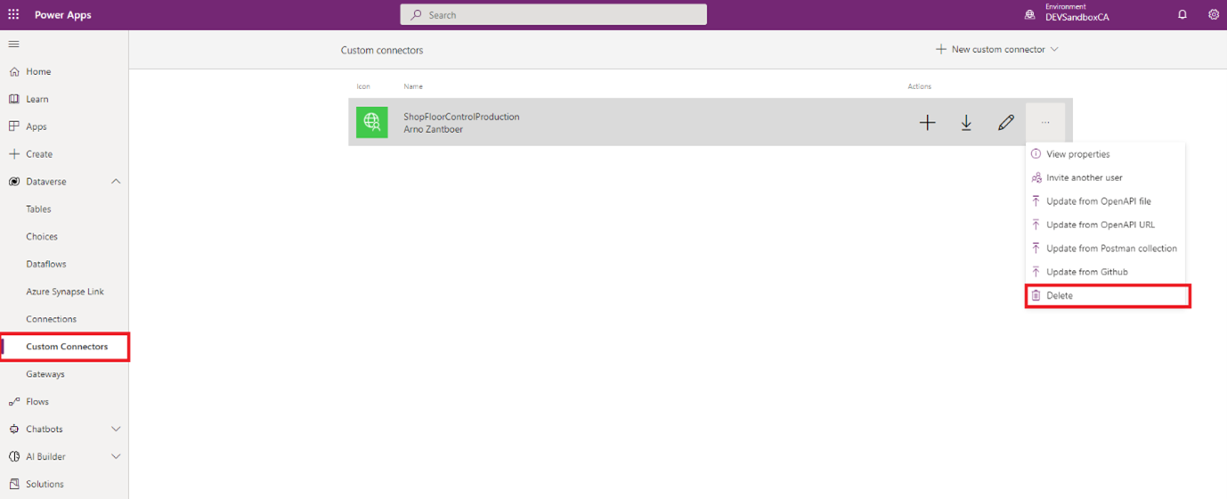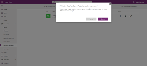 Delete the ShopFloorControlProduction Custom Connector from your environment via Dataverse > Custom Connectors.