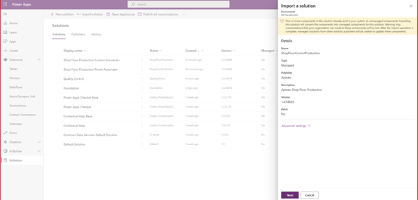 Import the new Shop Floor Production PowerAutomate Solution (Managed) v1.0.x.