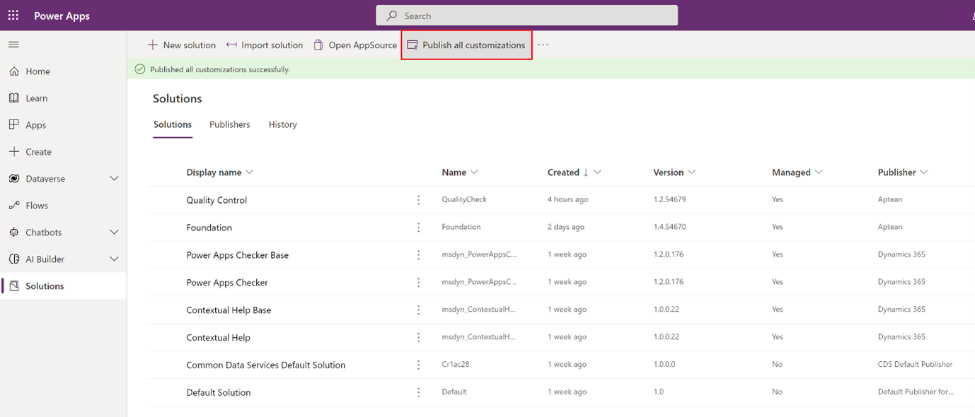 On the action bar, select Publish all customizations.