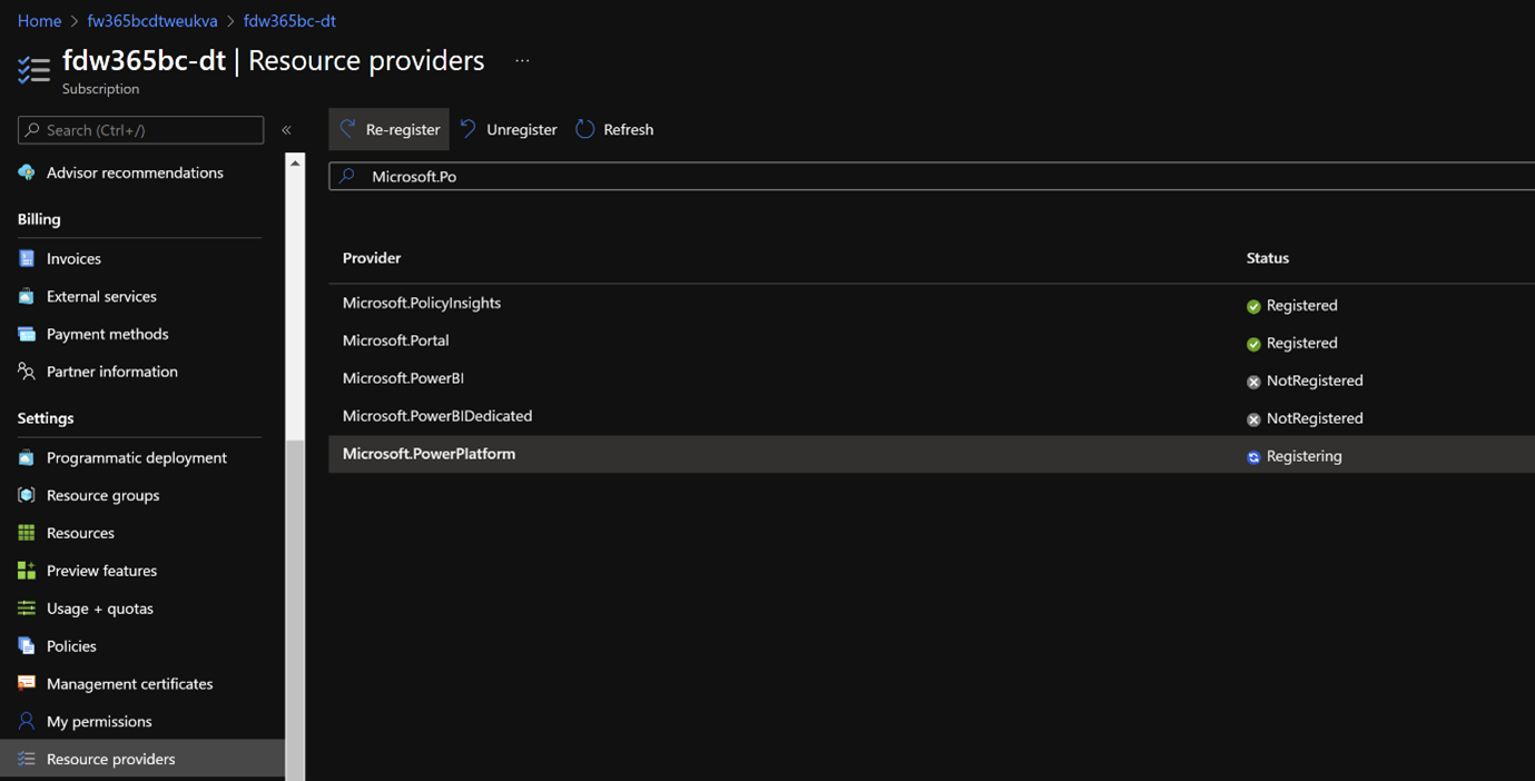 The Power Platform should be added as Resource Provider in your Azure Subscription.