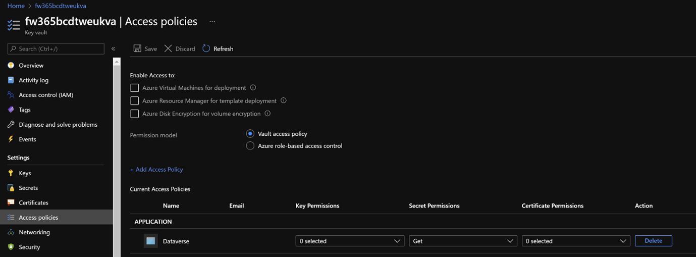 The new Custom Connector is configured using environment variables. One of the environment variables, fdw_ClientSecret_KeyVault is a secret that must be stored safely instead of in plain text in the variable value. This is done by storing the secret value in a Key-Vault that has to be setup first. To integrate the Power Apps environment with Key-Vault, it must be set up to get the ClientSecret from the Key-Vault and sign in by using the OAuth flow for the Custom Connector.