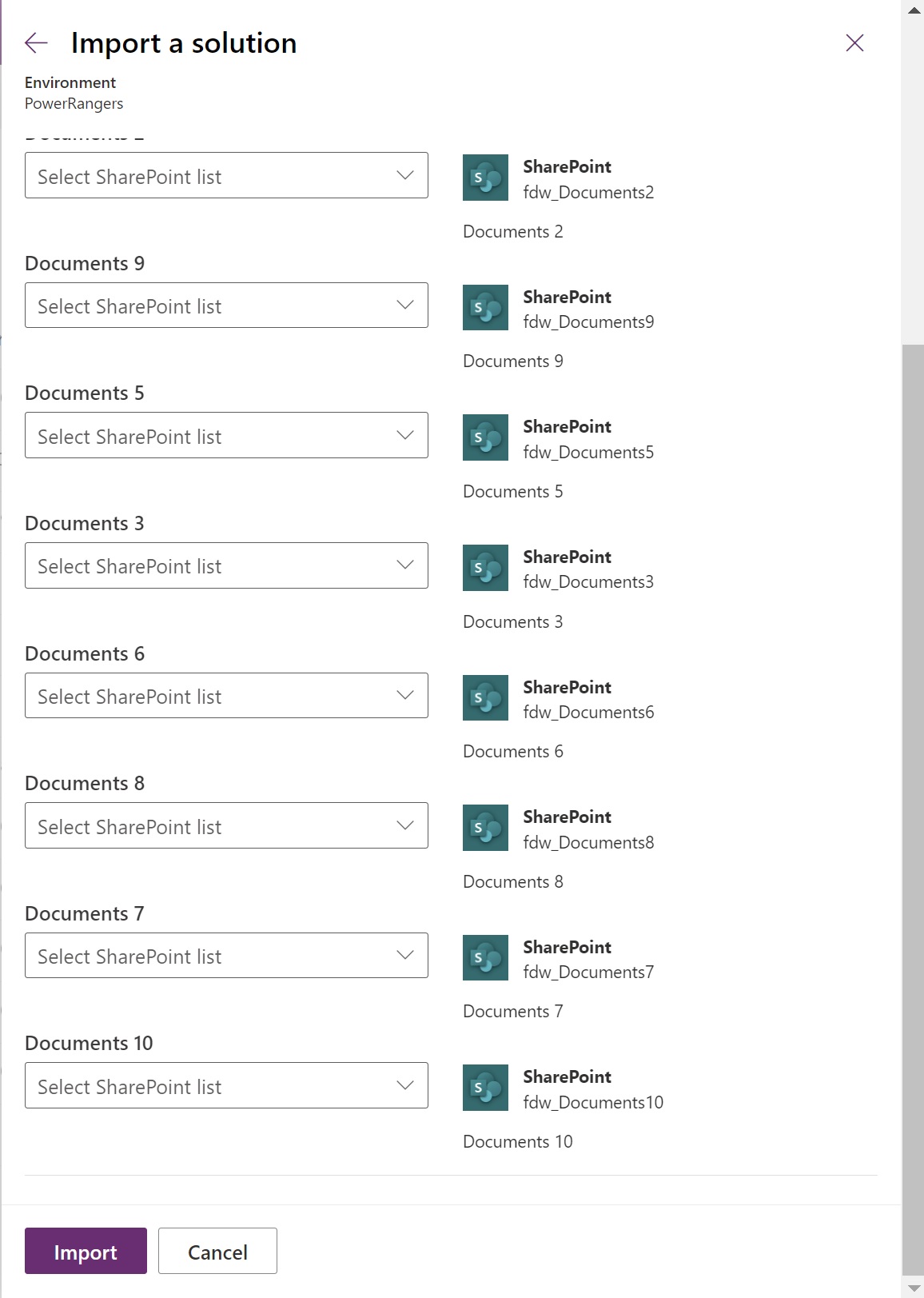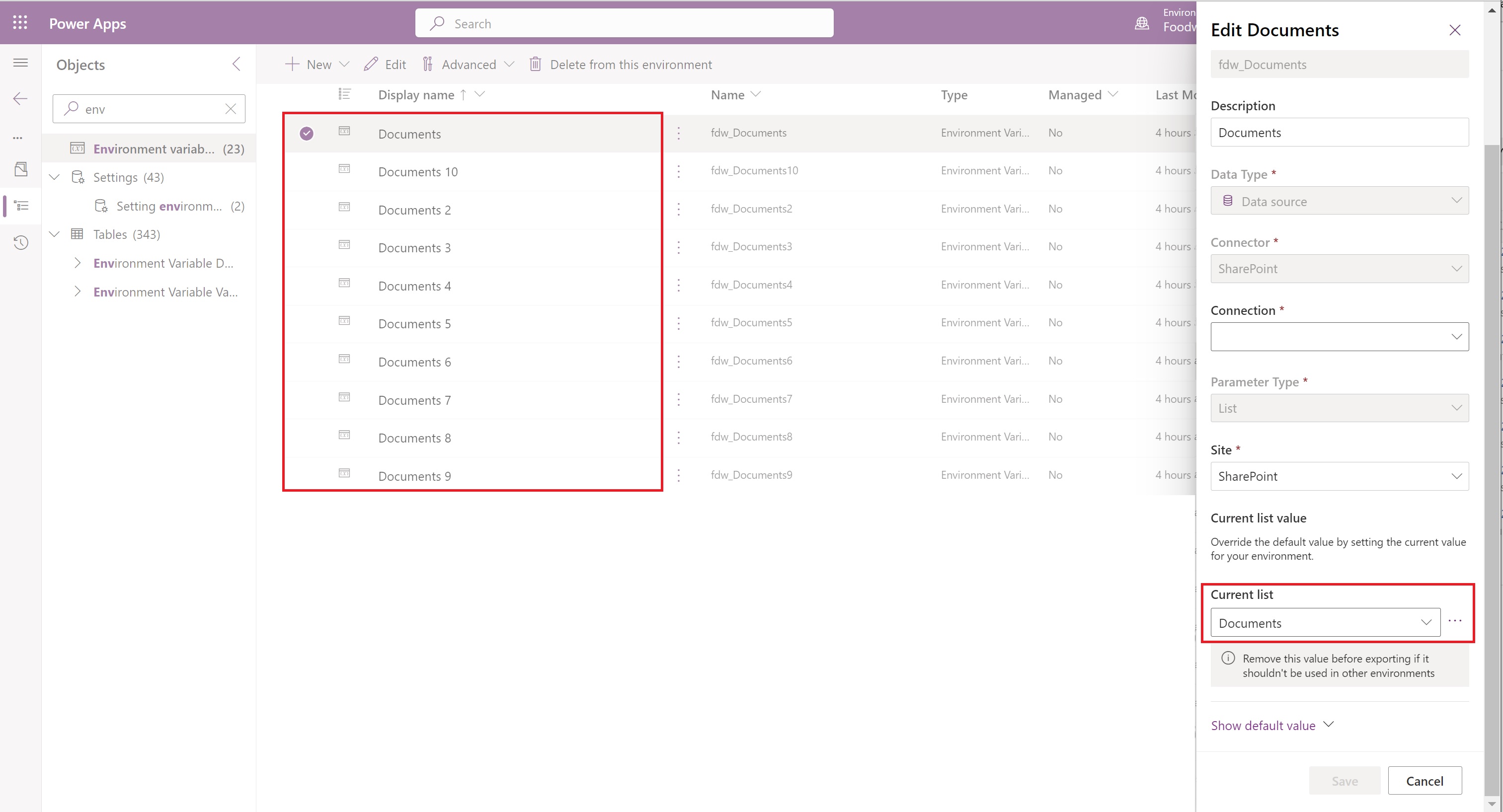 Each Document Environment Variable must be set up properly. When only one variable is needed, all the values can be set to the same document library. To use more document libraries, you can change it via Default Solution > Environment Variables.