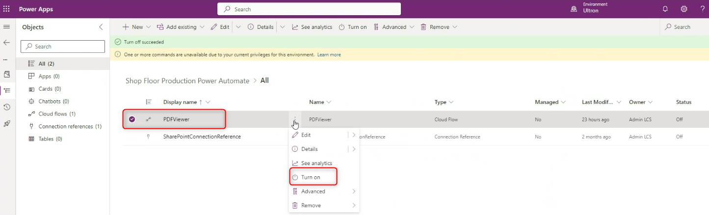Turn on PDFViewer on the Shop Floor Production Power Automate page to view the required PDF.