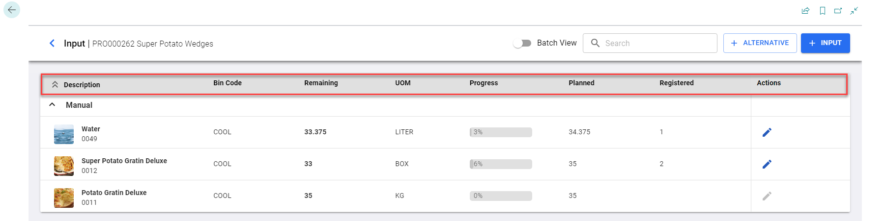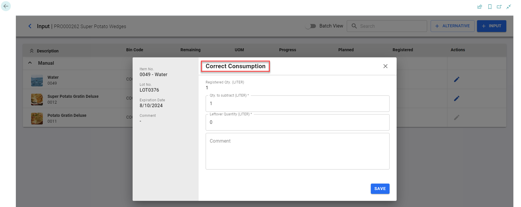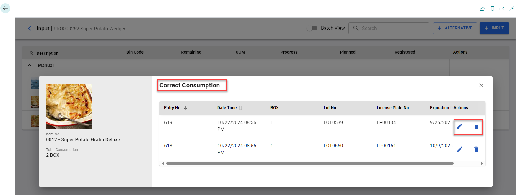 - Once registered, you can correct the consumption for the registered input line by using the edit icon.