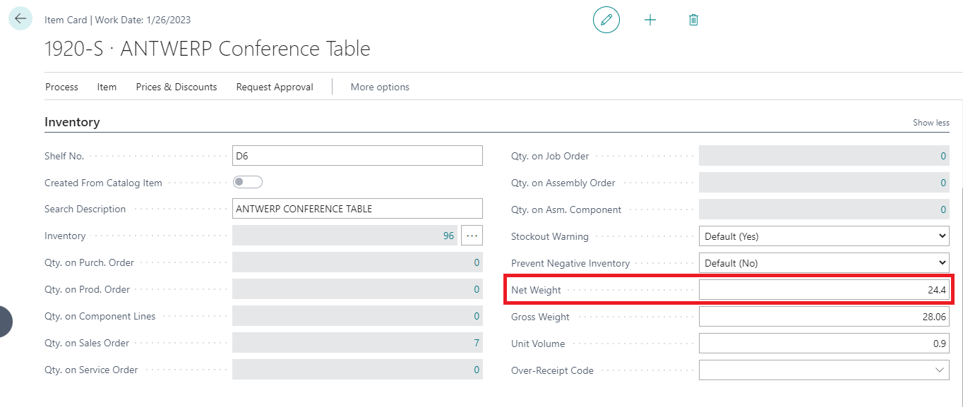 On the Inventory FastTab, enter the weight value in the Net Weight field.