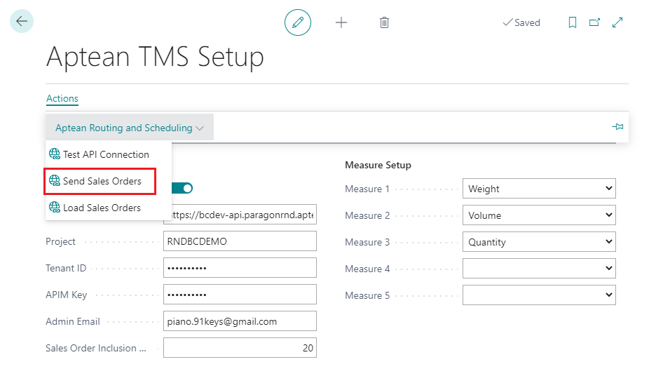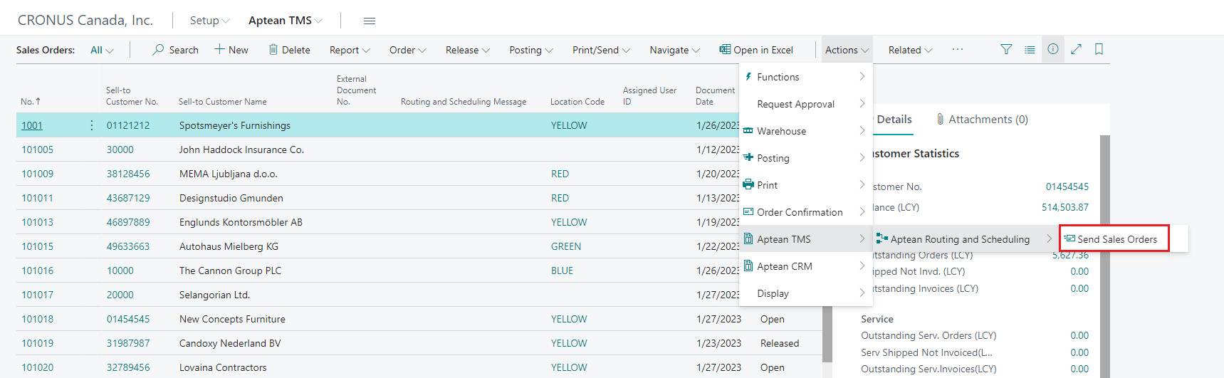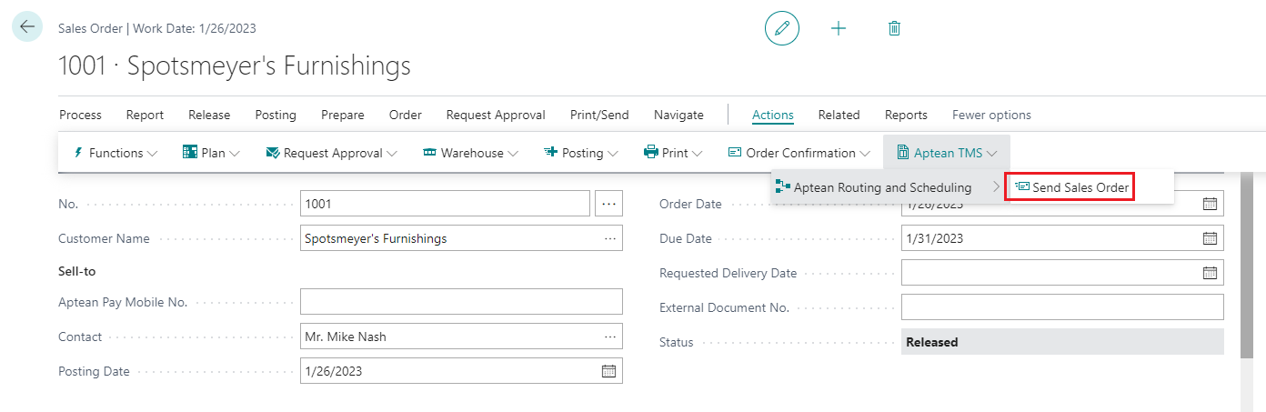 On the action bar, go to Actions > Aptean TMS > Aptean Routing and Scheduling > Send Sales Order.