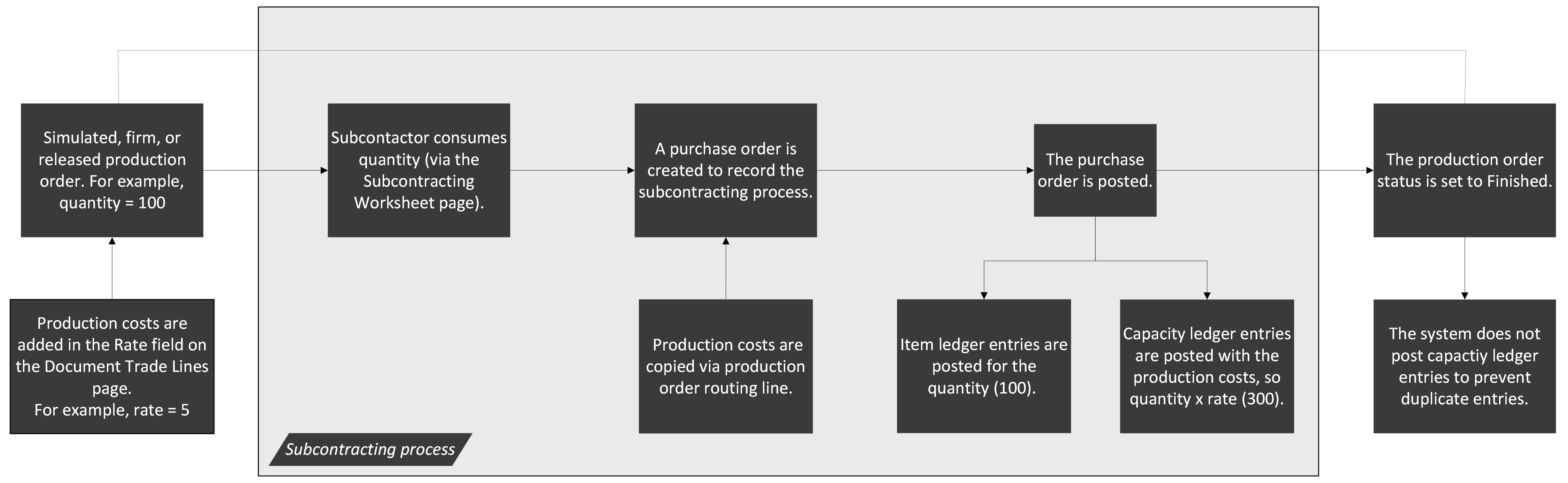 If the production process is subcontracted, the system does not post capacity ledger entries when the production order is set to Finished to prevent duplication of production costs. In this scenario, capacity ledger entries and linked value entries are created upon posting or invoicing the purchase order that was created by the subcontracting worksheet.