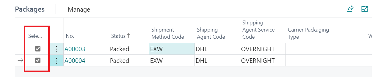 If multiple packages exist for a sales order, it is possible to combine them together into a single package. You must indicate which packages will be combined by placing a check mark in the Selected field on the relevant package lines.