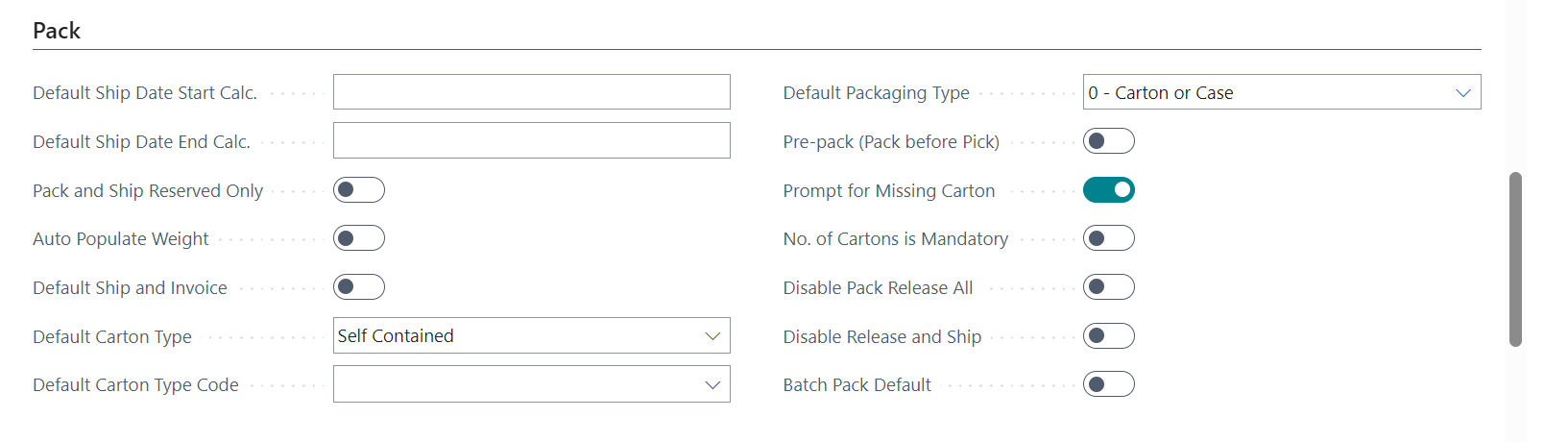 - Pre-Pack (Pack before Pick): Turn on this toggle to enable the program to create package records for items on a warehouse shipment prior to the picking activities for these items has been posted. If this field is left unchecked, items must be picked before they can be assigned to package records. Please note that permitting the packaging of items prior to picking does not eliminate the picking requirement altogether, as items must still be picked before the warehouse shipment can be posted.