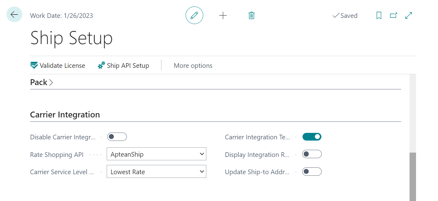 - Disable Carrier Integration: Turn on this toggle if you want to disable any existing carrier integration. While environments in which carrier integration is present will normally wish to have this integration activated, it may be necessary to temporarily disable it on occasion for troubleshooting activities. Please note that many of the records contained within Aptean Pack and Ship RapidStart Package are set up to require connectivity with the 3rd Party Shipping Integration. If RapidStart is being utilized to configure Aptean Pack and Ship, but 3rd Party Shipping Integration will not be used to process shipments, carrier integration should be disabled.