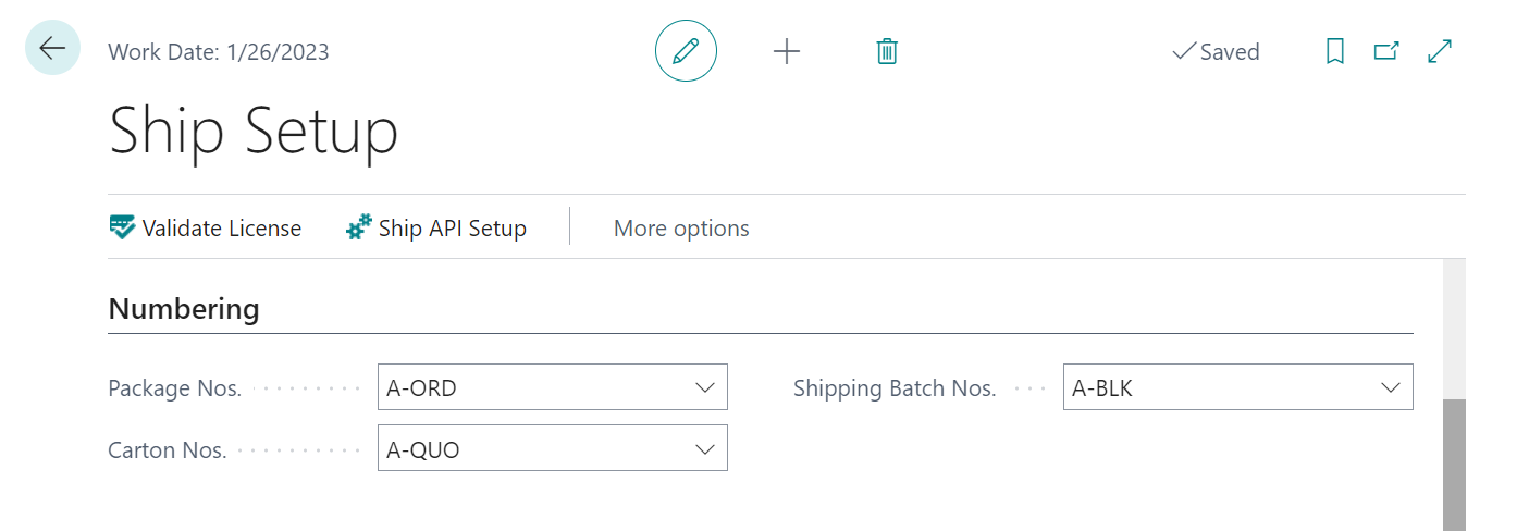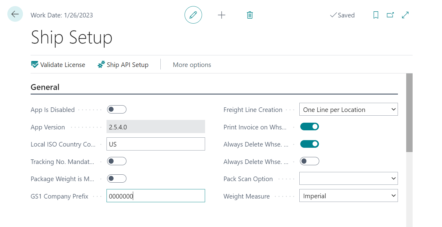 A number of values must be configured before you can use the Aptean Pack and Ship solution. These settings are entered in the Ship Setup page, which can be accessed by entering ship setup in the search bar.