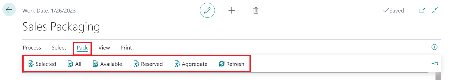 - Aggregate: Combines existing package records together into a larger package. If mistakes are made or you simply wish to restart the packaging process, you can click Pack > Refresh to reset the value in the Qty. to Pack field for all items to zero.