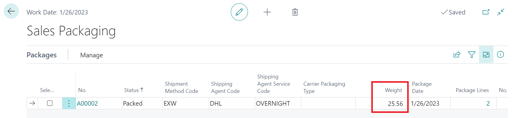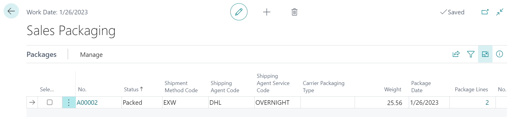 When you select a package option, a new package record is created. A sales order’s existing packages are displayed on the Packages FastTab.